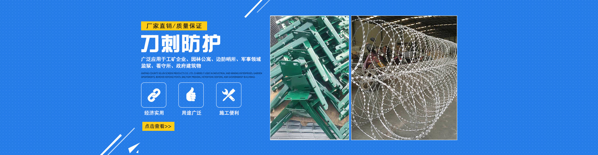 刀片刺繩?是一種新型防護(hù)網(wǎng)產(chǎn)品,具有生產(chǎn)工藝復(fù)雜、防護(hù)效果好、施工方便等優(yōu)點(diǎn)。如果你想知道,請(qǐng)看以下內(nèi)容。